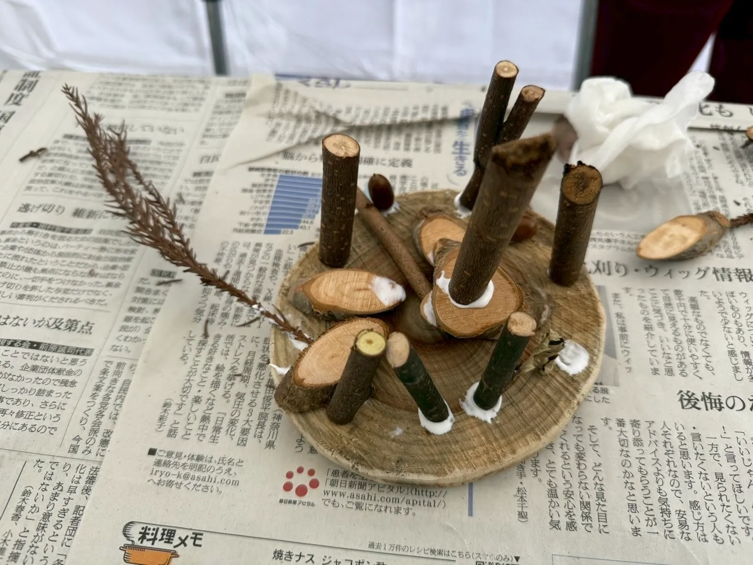 村内で伐採されたひのきの丸太にボンドで貼り付けて、子どもたちは葉を髪の毛に見立てたり、どんぐりや枝を積み上げて小さな家を作ってみたりと、個性あふれる作品を作っていました!